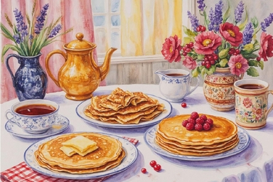 На мастер-классе по живописи акварелью «Масленица» участники создадут яркую праздничную композицию, вдохновленную теплыми красками народного гулянья: золотистыми блинами, разноцветными платками, солнечными лучами и веселыми качелями.