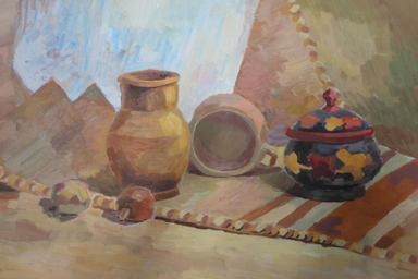 Живопись способна передавать на плоскости объем и пространство. Главное выразительное средство живописи – цвет, его способность вызывать различные чувства, ассоциации, усиливает эмоциональность изображения. В тематических натюрмортах представлены предметы, используемые в повседневном быту-разнообразные по форме, фактуре, материальности.